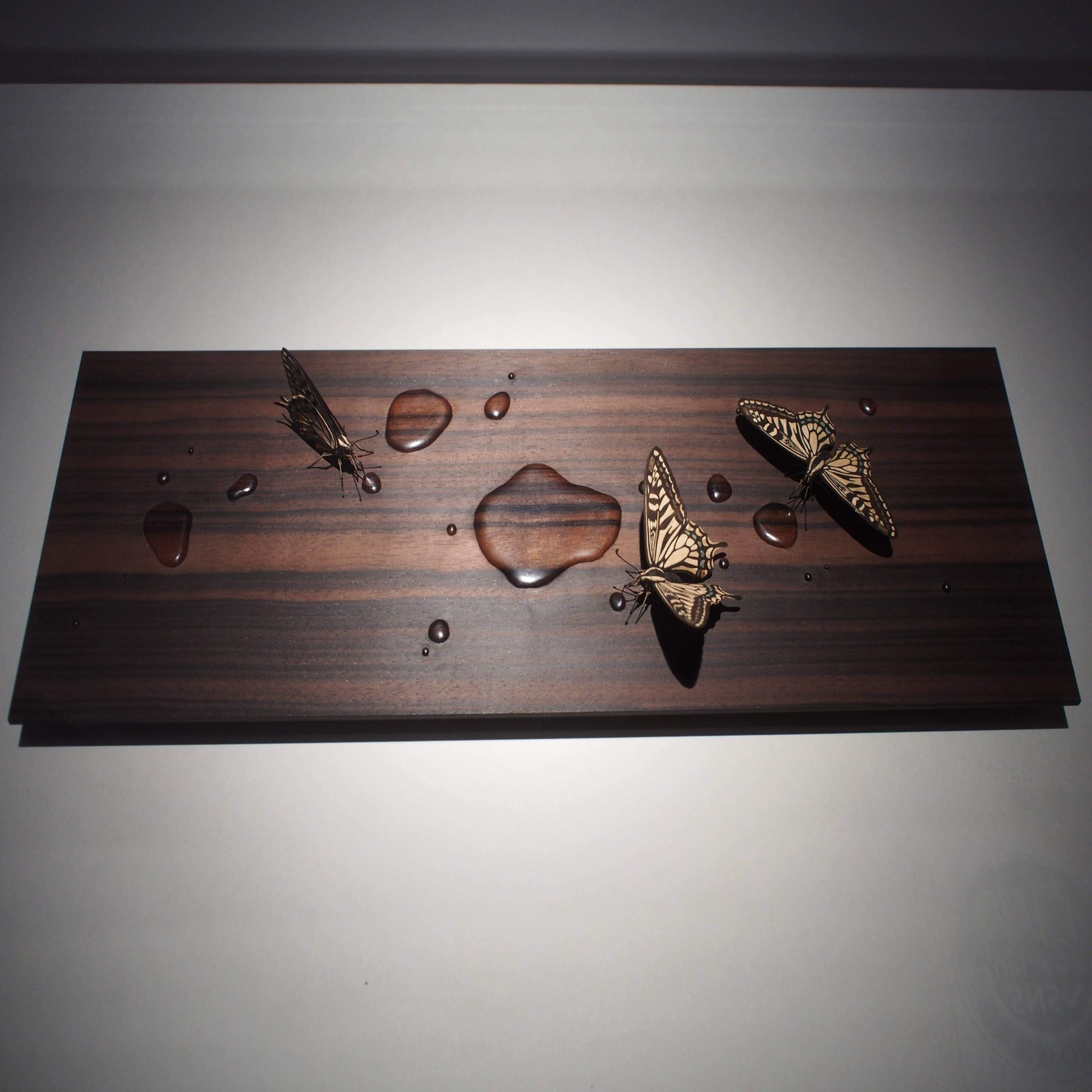 こちらは一枚の木ではないが、着色はしておらず、木本来の色を生かしたものであるらしい。ちなみに水滴の部分が盛り上がっているが、それは逆に水滴以外の部分を削って水滴を表現している。